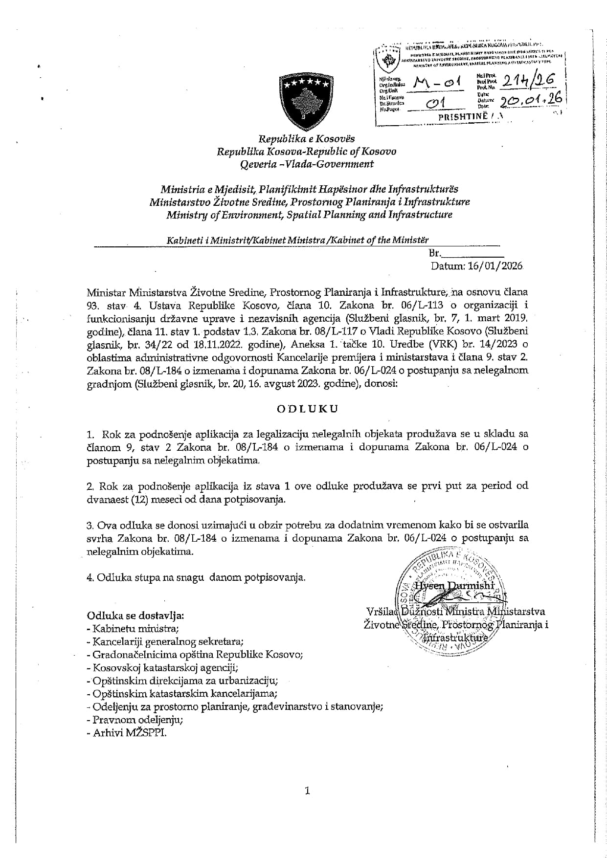 Prema odluci Ministarstva, ovaj rok se prvi put produžava za period od 12 (dvanaest) meseci, počev od dana potpisivanja odluke. Odluka je doneta uzimajući u obzir potrebu za dodatnim vremenom, kako bi se postigli ciljevi Zakona br. 06/L-024.